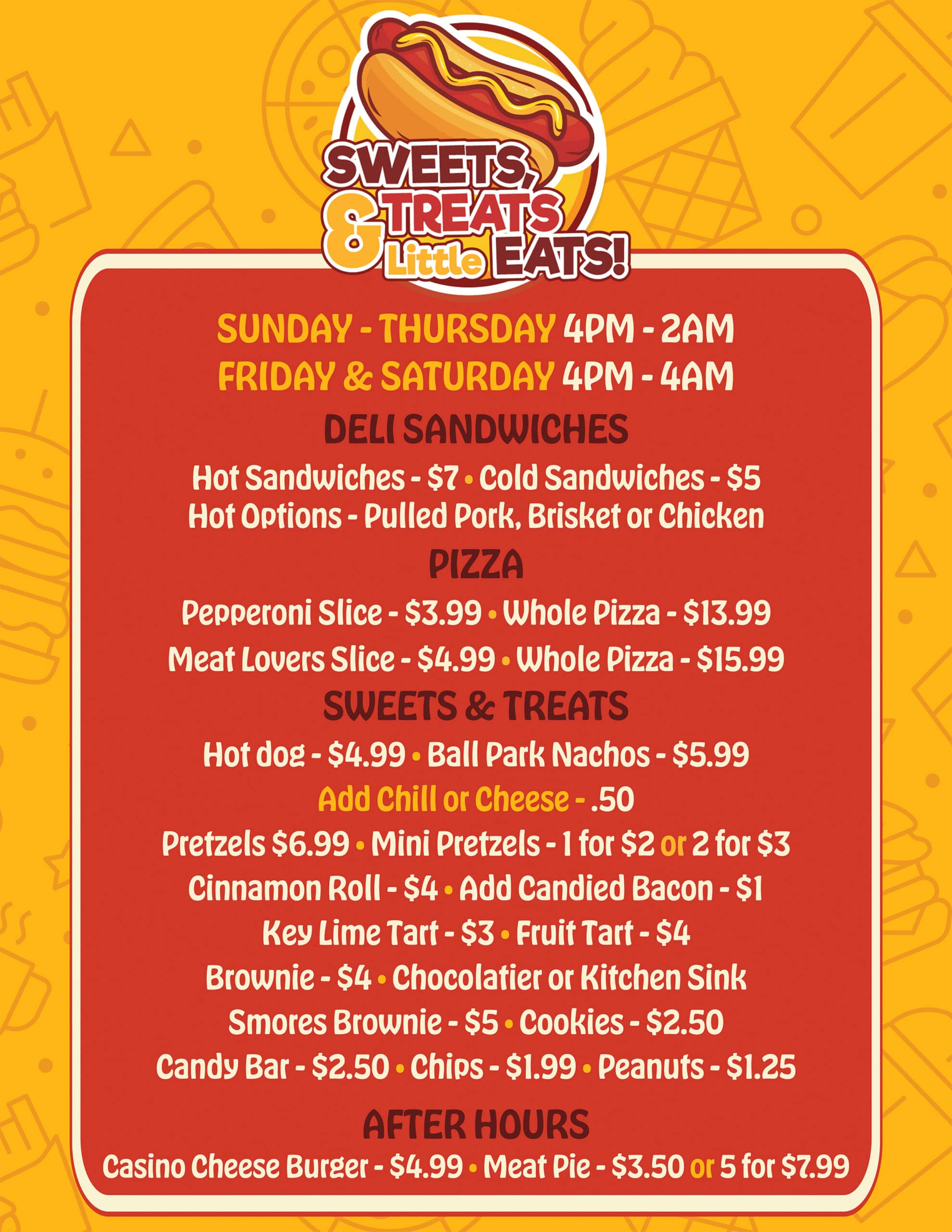 Need a quick snack while playing your favorite gaming machine? We have specialty baked pizzas, burgers, snacks, pastries, pretzels, hot dogs and beverages.